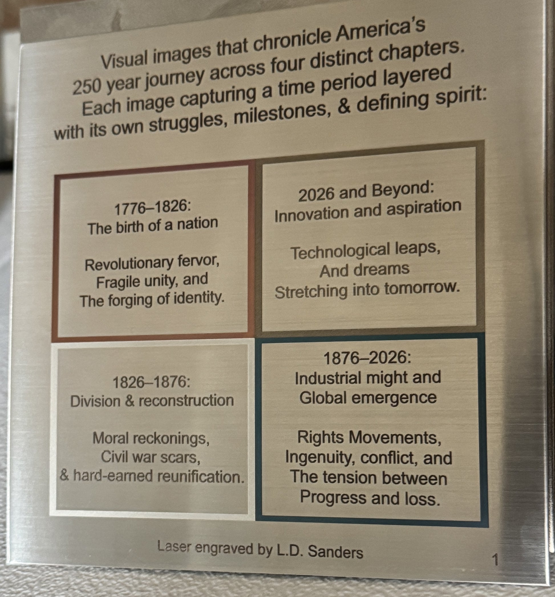 Color engraved stainless steel showing 4 images and different journey time points of the USA on its path to the 250th year celebration. With short descriptions on the backside of the engraving.